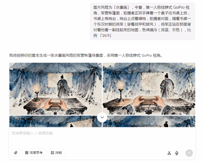 元宝ai和豆包现在都可以直接在对话里生图,你可以直接让它生成相应的分镜图片,也可以自己使用ai生图工具生成。个人建议在确认分镜脚本满意的情况下,可以让ai按分镜脚本直接生成相应的提示词,因为ai生成的提示词会更专业(主要体现在镜头运用等方面,这是我们普通玩家的知识盲区),ai更容易理解,同时你也可以借此学习一下怎么写专业的分镜提示词。