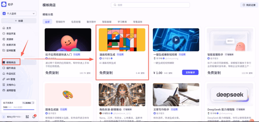 如果你不想折腾,可以使用别人搭建好的工作流不过效果如何未知,记得看评论,可最大程度避免踩坑。主要两种途径一是模板商店,一是作品社区,比如模板商店里官方就提供了这个各大平台都很火的漫画视频工作流。