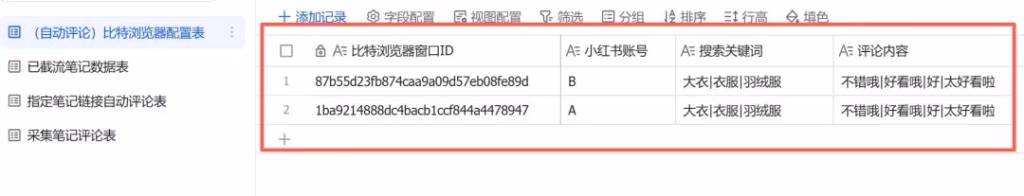 下面是比特浏览器的配置字段,把需要进行评论的账号,以及评论内容,需要提前填写到模板里。