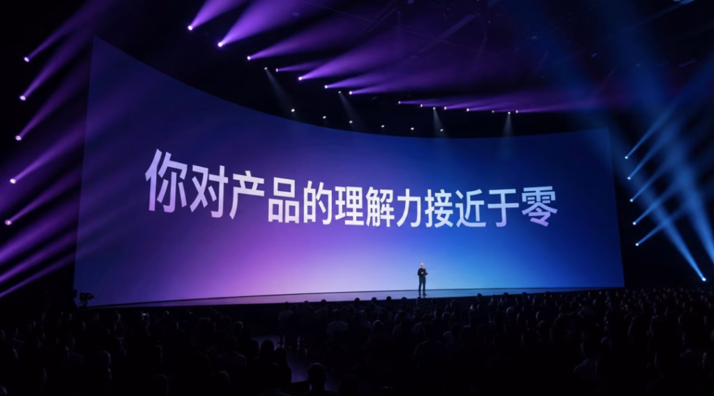 提示词:(@stark_nico99)根据文字生成一张照片:一个宏大的苹果发布会现场,现场很多观众,场景很暗,有绚丽的灯光,镜头聚焦在很宽的大屏幕,弧形屏幕,文字和屏幕一样有一定的透视感,很小的人物剪影站在舞台上,紫色到蓝色弥散背景上,白色文字有一些渐变,像是现场实拍,高级感 16:9