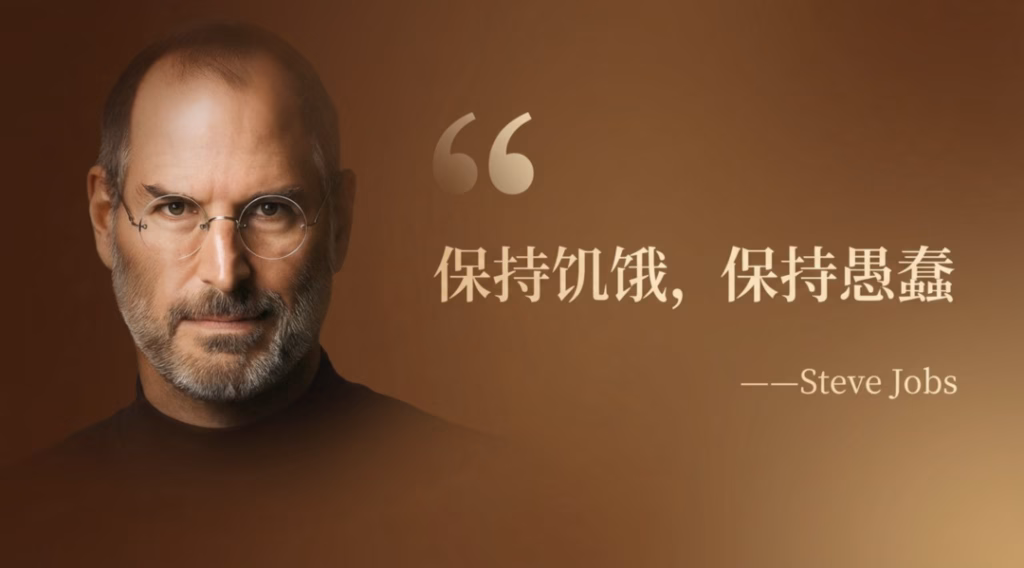 提示词:(@stark_nico99)一张宽的名人金句卡,棕色背景,衬线体浅金色 “保持饥饿, 保持愚蠢” 小字“——Steve Jobs”。文字前面带一个大的淡淡的引号,人物头像在左边,文字在右边,文字占画面比例2/3,人物占1/3,人物有点渐变过渡的感觉