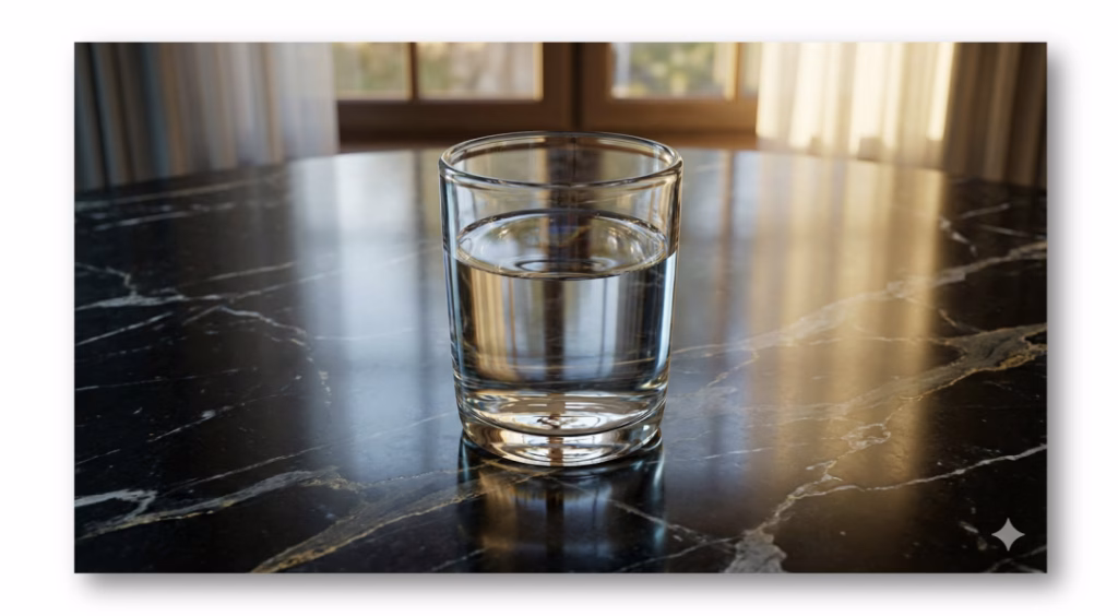 场景:一个玻璃杯放在黑色大理石桌面上。光照逻辑: 主光源来自右上方 45 度的暖色窗光,左侧有一个冷色补光灯。物理要求: 请准确计算窗框在玻璃杯曲面上的折射变形,以及大理石桌面上漫反射与镜面反射的混合效果。