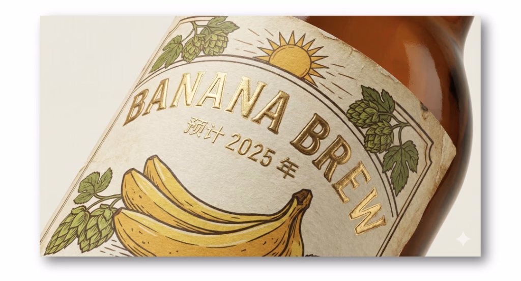 风格:复古美式。主标识“BANANA BREW”采用定制的衬线字体,略微弯曲环绕在罐体上。底部以小号无衬线字体标注“预计 2025 年”。
