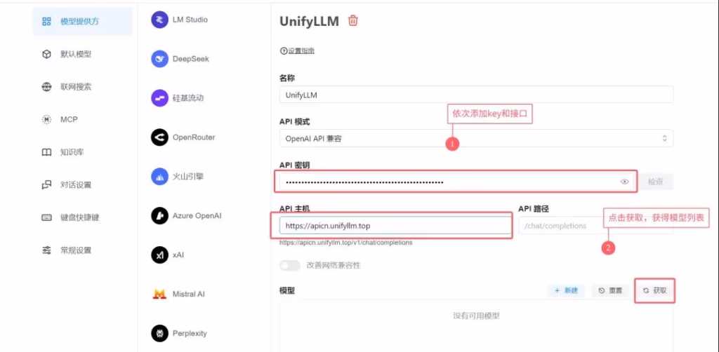 2.2、我们点开UnifyLLM服务商,并依次填写apikey和接口信息,注意看小字提示,如果你拼接后,和截图一毛一样,那就对了。