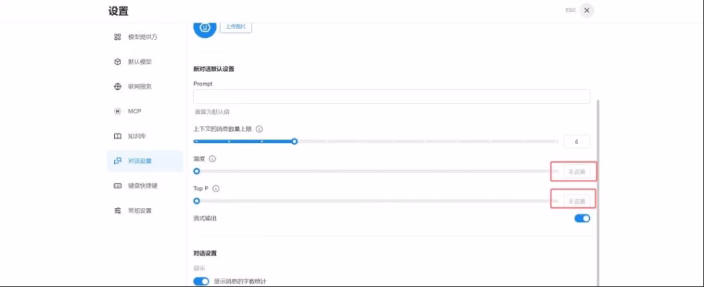 2.6、对话设置中,建议取消温度和top的默认设置,避免引起错误: