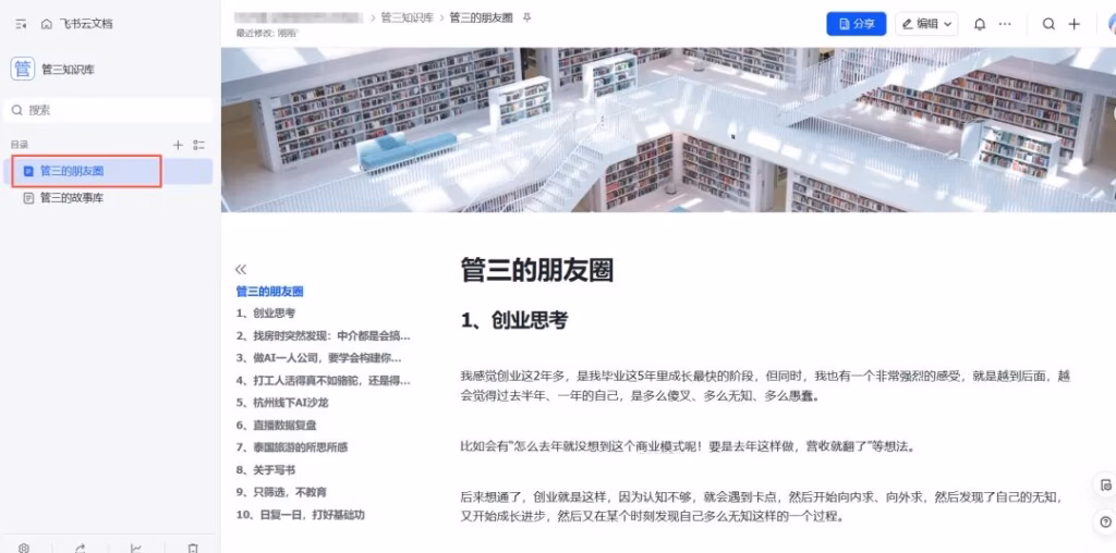 那很简单,你只需要把你过的内容,分类整理到飞书知识库里即可。