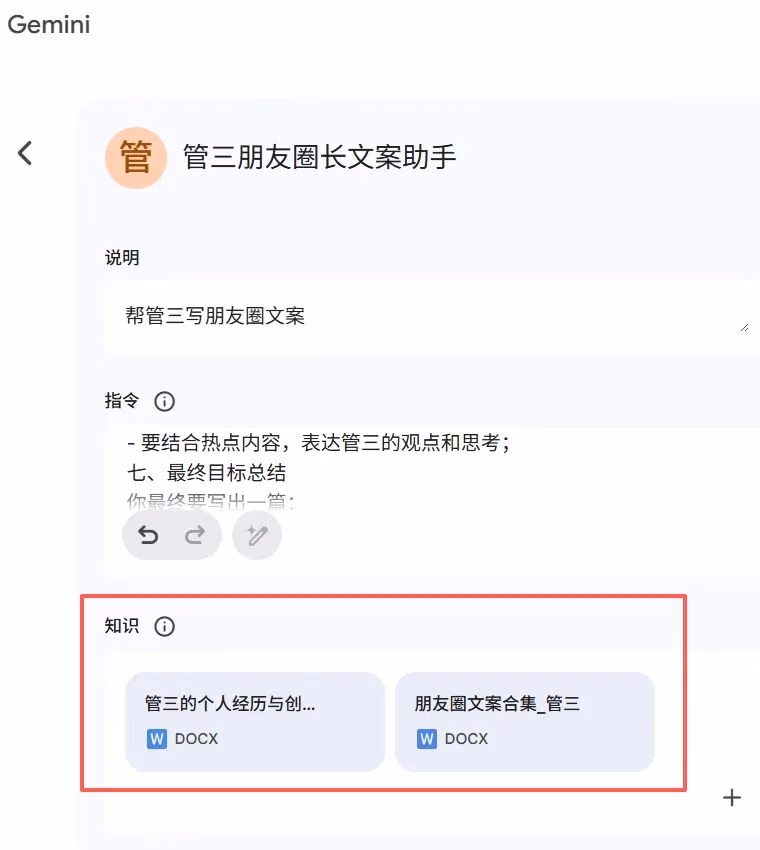 在飞书文档右上角点击“…”,点击“下载为”,选择“导出为 PDF 或 Word”。 然后按照上一篇文章里的保姆级教程,《10分钟精通Gemini3和NanoBanana2》到Gemini创建智能体的编辑页面,点击“知识”旁边的加号,把刚才导出的文件传上去。 如下图所示👇