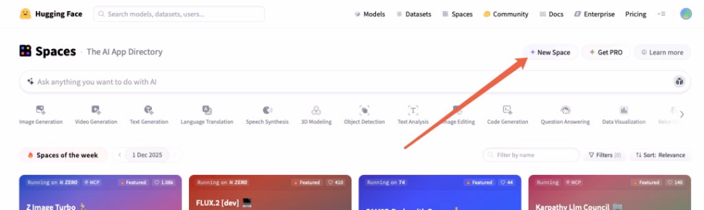 Spaces 是 Hugging Face 提供的云托管环境(免费的 2 核 16G 配置),核心价值是 “降低 AI 应用落地门槛”—— 无需自己搭建服务器、配置环境,通过简单配置就能将本地代码、模型变成可公开访问的在线服务或交互式 Demo。