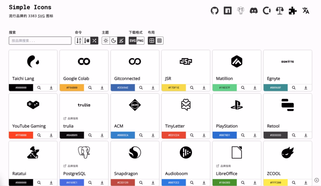 - 推荐理由: 当你需要找 微信、淘宝、GitHub、Twitter 等品牌 Logo 的单色图标时,它是最佳选择。