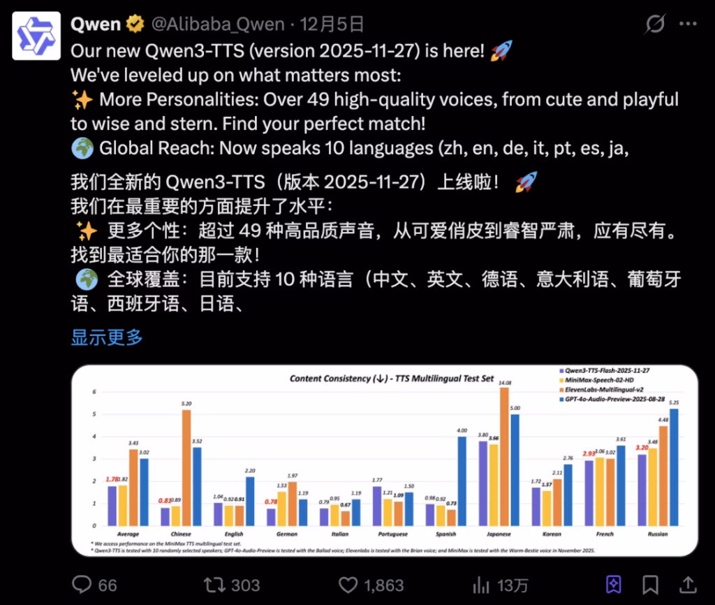 而且一出手就明显是冲着「自然度 + 多音色 + 多语言」这一代标准去的。