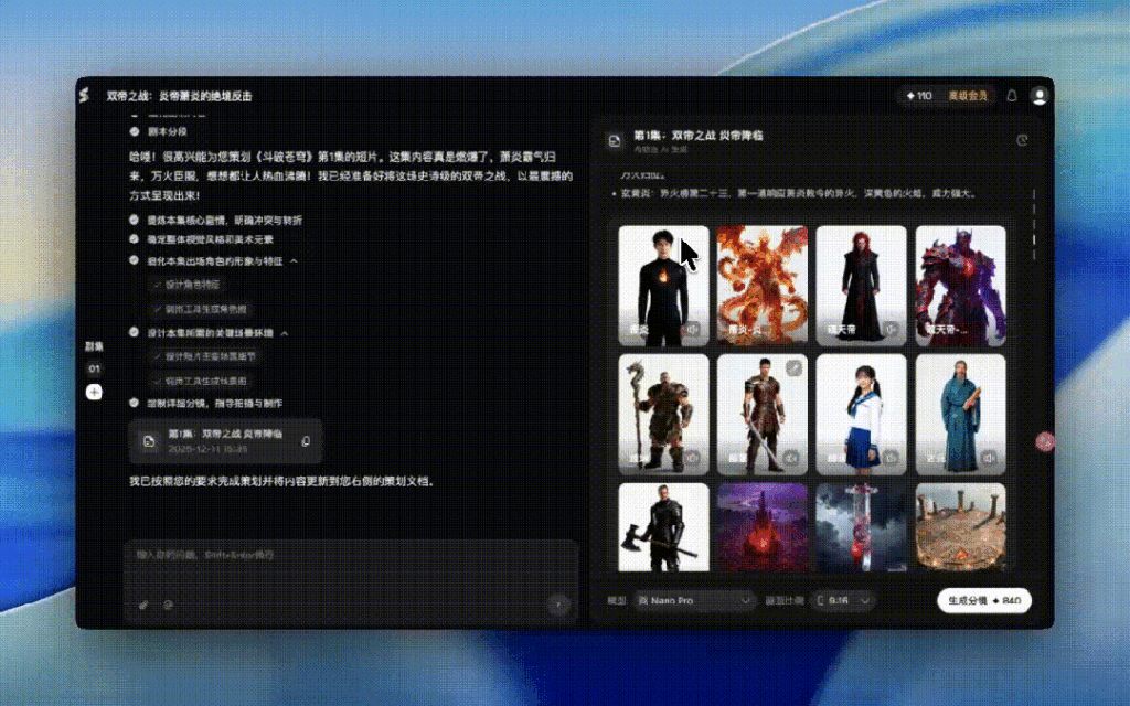 它是一个Agent,只需要给一个方向,就能自动直出剧本、分镜、人物、场景、风格、批量出分镜图、批量转视频,甚至配音,BGM都给你裁剪卡上了,最后导出一个完整的作品。