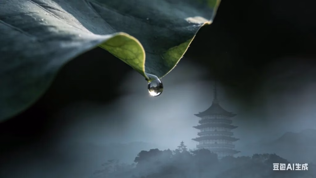 生成一张极具东方美学的微距摄影。清晨,幽暗的背景中,一片巨大的荷叶边缘,悬挂着一颗将落未落的露珠。透过露珠,隐约折射出虚幻的远山古刹倒影。光影氛围: 梦幻、迷离、稍纵即逝的脆弱感。风格: 类似宋代《出水芙蓉图》的笔意,极简,留白,无人的空灵之境。