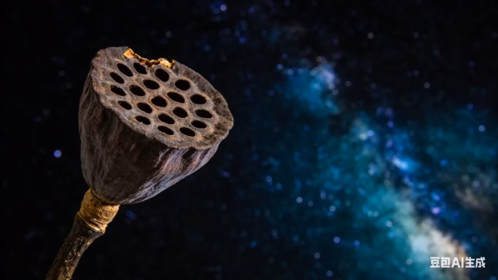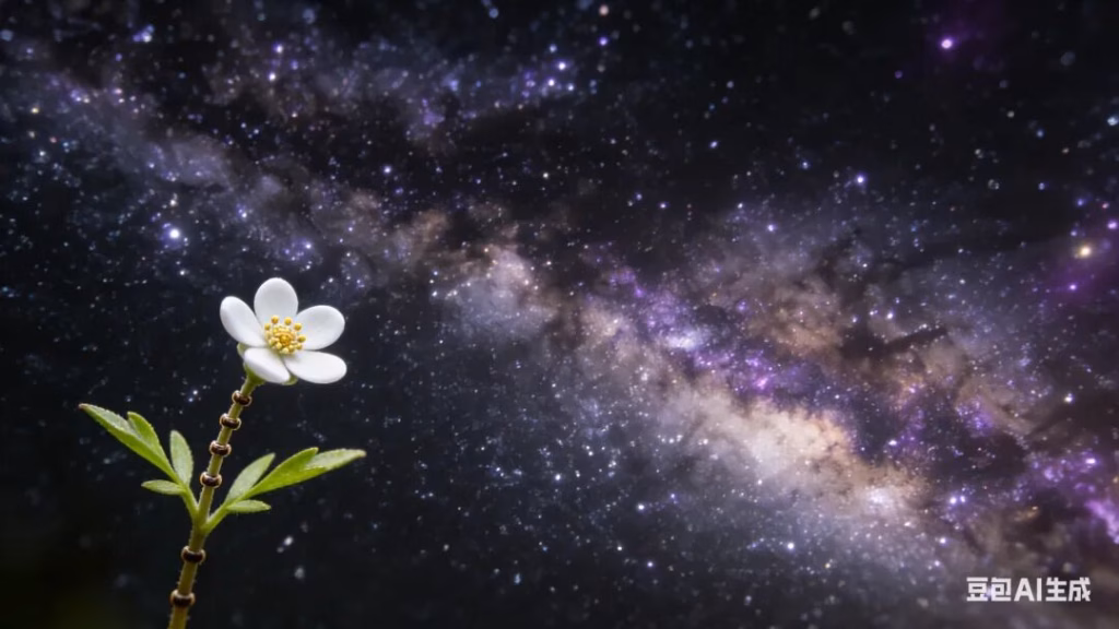 极具艺术感的特写。一支枯干的莲蓬(或一朵极小的野花),孤立在画面的角落。背景是虚化的宏大山川或星空,形成极致的大小对比。意境: 以小见大,微观世界里藏着宏大的宇宙观,禅机深藏。