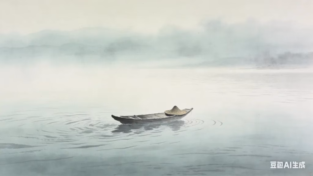 宋画意境的空镜头。浩渺无际的烟雨江景,水天一色。江心只有一叶扁舟随波逐流,船上空无一人,只有一顶斗笠落在船头。色彩: 极低饱和度的水墨青灰色。氛围: 表现“寄蜉蝣于天地”的辽阔与孤寂,心无所住的自由感。