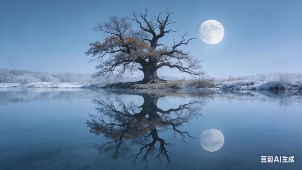 极具哲理的风景摄影。平静如镜的寒潭水面,清晰地倒映着岸边一棵枯荣参半的古树和一轮孤月。构图: 只拍水面,让倒影占据画面主体,实景在画外,虚实难辨。质感: 冷冽、清透,表现“镜花水月”的虚幻与空灵,无人。
