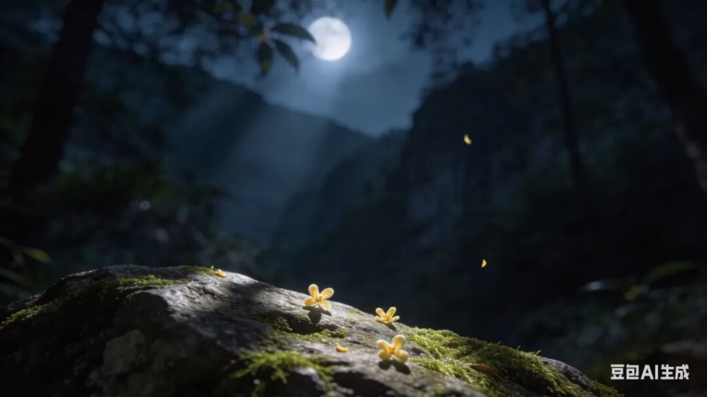 深山幽谷的特写镜头。一块布满青苔的静石上,几朵细小的桂花刚刚飘落,静止不动。背景是幽深的空山。光影: 斑驳的月光透过树林洒在石头上。氛围: 强调一种“时间凝固”的静谧感,万籁俱寂,狂心顿歇,极简主义。