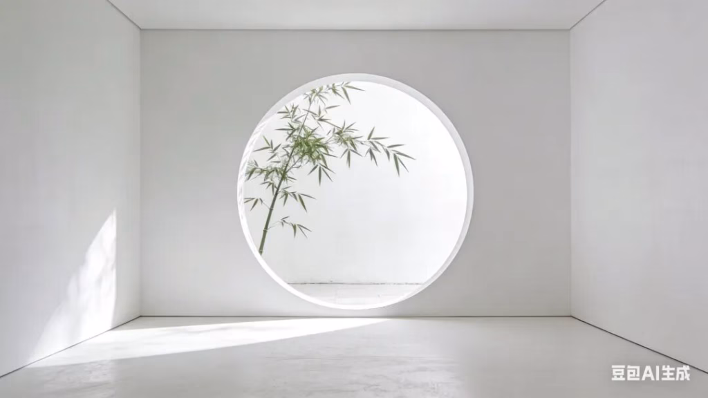 极简主义的禅宗空间设计。一间纯白色的禅堂,空无一物。只有一扇圆形的窗户(月洞门),借景窗外的一枝翠竹和白墙。光影: 柔和的漫反射光线,干净、通透、一尘不染。意境: 表现“空”的极致境界,无物,无尘。