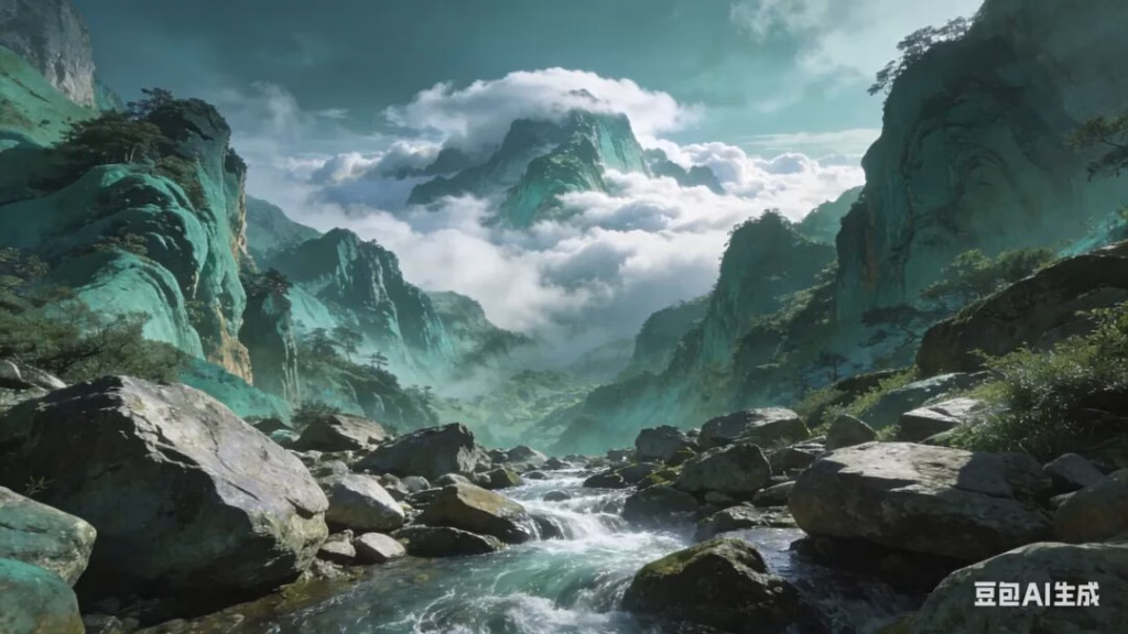 宏大的国风山水摄影。视线尽头是山间溪流的源头,乱石堆叠。抬眼望去,远处的山巅之上,云海正在翻腾涌动,气象万千。色调: 青绿山水风格。意境: 表现绝境逢生的豁达与自然造化的神奇,无人,壮丽。