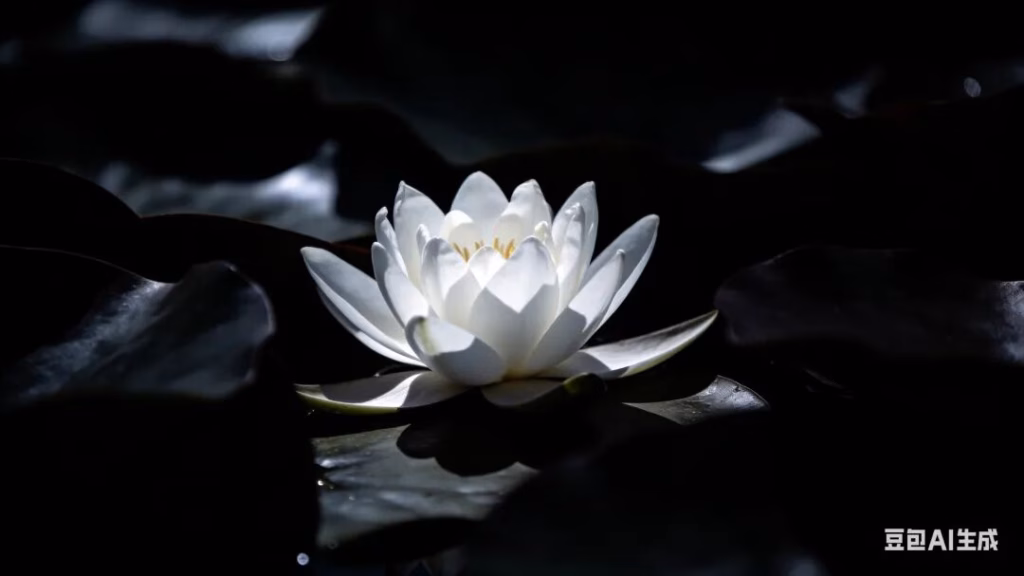 暗调微距摄影。漆黑幽暗的背景中,一朵白莲独自盛开,散发着圣洁的微光。周围是模糊的墨色荷叶。光影: 强烈的明暗对比(Chiaroscuro),花瓣洁白无瑕,与周围的黑暗形成反差。意境: 表现本性清净,不被世俗污染,唯美,静谧。