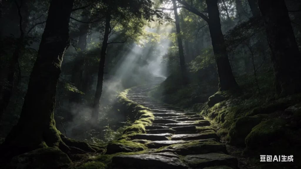 幽深的密林古道。一条蜿蜒的石阶路布满苍苔,延伸向迷雾深处,不见尽头。阳光透过树叶形成一道道丁达尔光束(耶酥光),照亮了空气中的尘埃。氛围: 幽深、神秘,视觉上表现出“听觉”的通感,空山寂寥。
