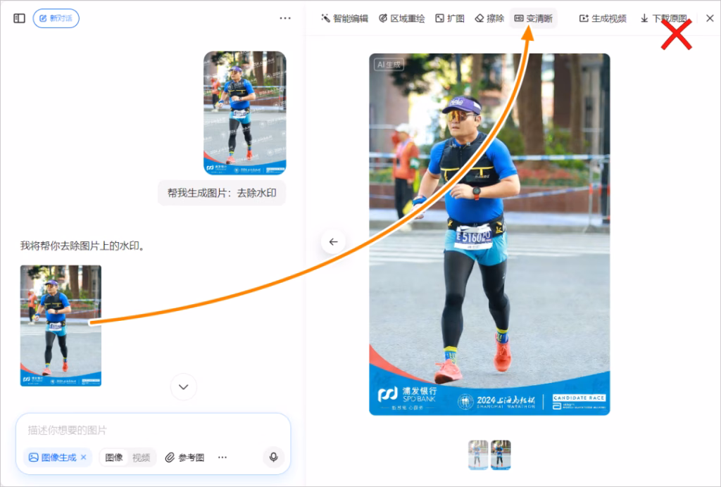 然后这张去水印结果图,会被作为 AI 超清的输入图被发送到对话框