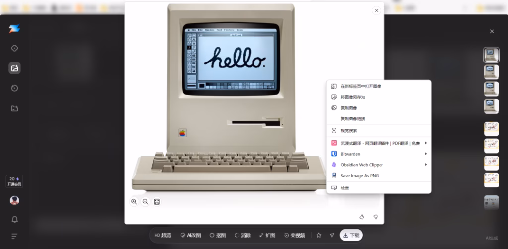 直接对着这个小图,右键另存为,你就会发现保存下来的图片左上角没有了 AI 生成的水印。