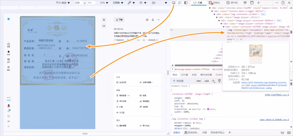 然后点击「元素拾取」按钮,接着点击网页上的图片,接着在右侧你就能看到这张图片的「图片链接」了,双击之后复制图片链接,在新标签打开即可保存无水印图片