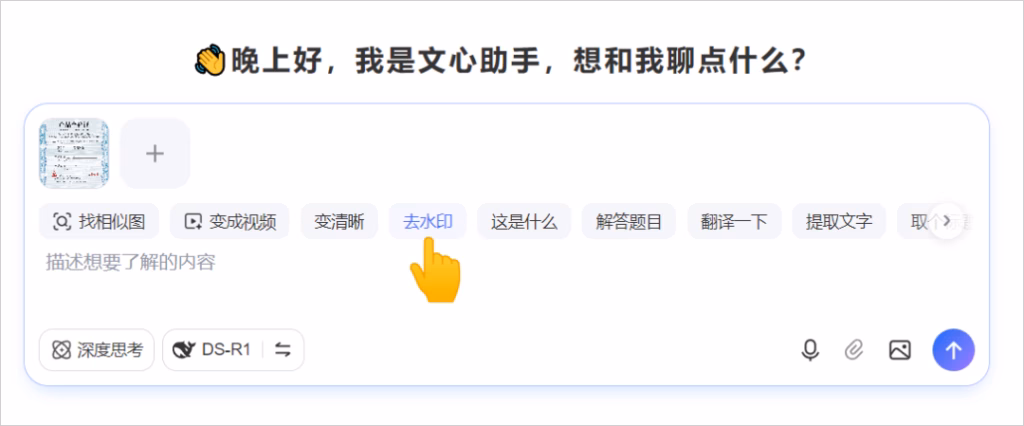 接着我们上传图片,文字描述让 AI 帮忙去掉水印