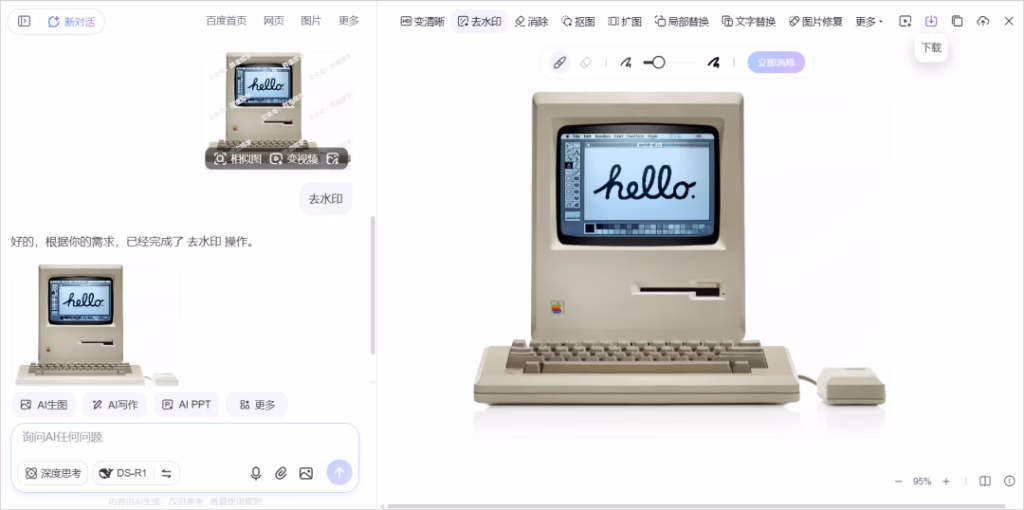 优点是处理后的图片不会被降低分辨率,并且也不会再添加上百度的水印,直接就能下载到无水印的处理结果图