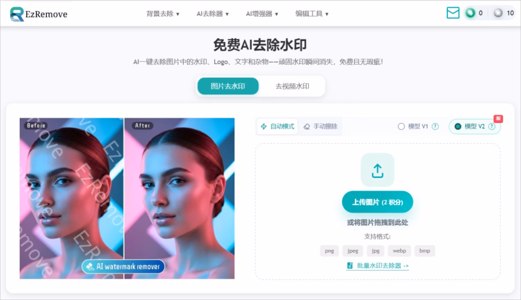 无需登录即可使用,每天 3 次自动移除机会、10次手动移除机会,最大可上传照片不超过 10 MB